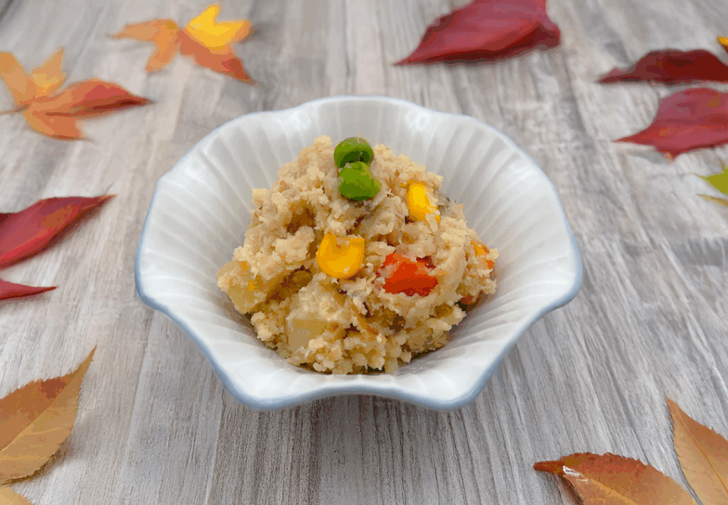 サイコロ状に切ったじゃが芋、人参等の根菜を入れ、すりおろした山芋をつなぎに、しっとりとしたうの花に仕上がっています。具材のシンプルな味が広がる、優しい味のうの花です。