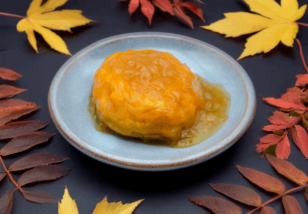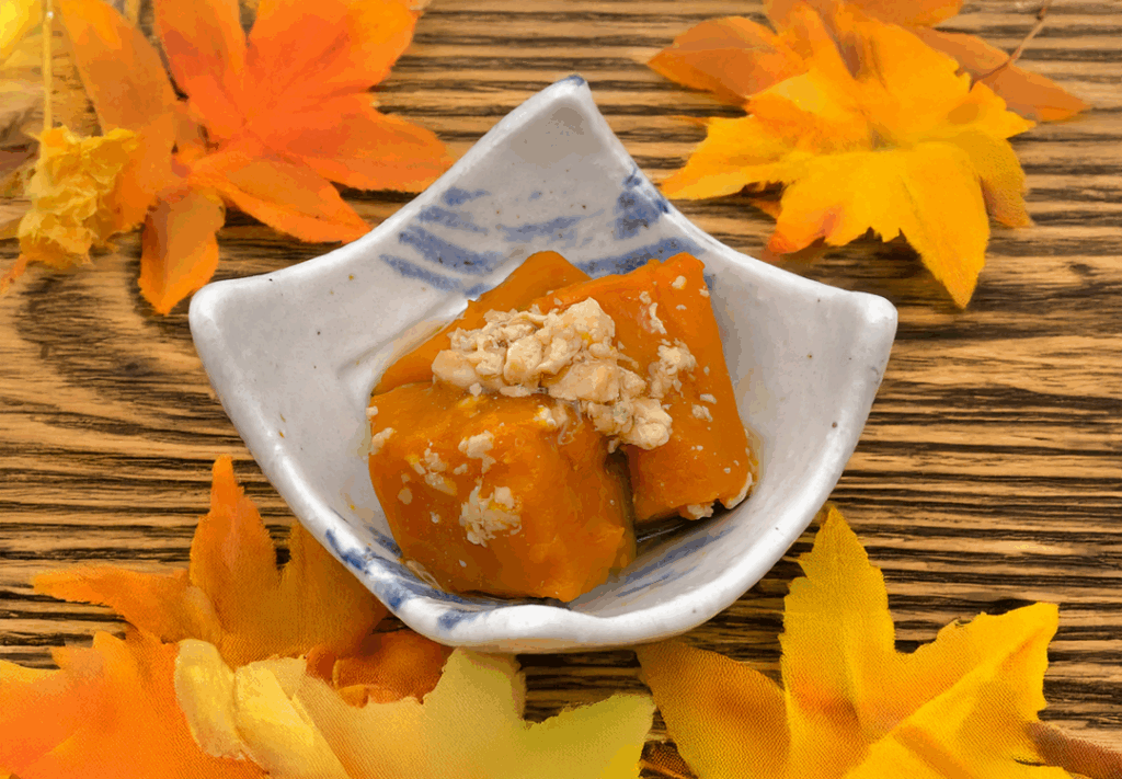 国産のかぼちゃに、菜彩鶏のそぼろを入れ、コクのあるかぼちゃの煮物にしました。