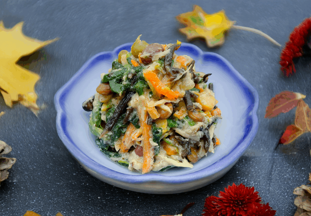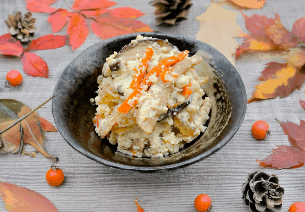 しめじ・椎茸・エノキに、人参とこんにゃくを入れ、白和えにしました。甘みを抑えたなめらかな食感の白和えは、旬のきのこを入れたことで秋らしいメニューになりました。