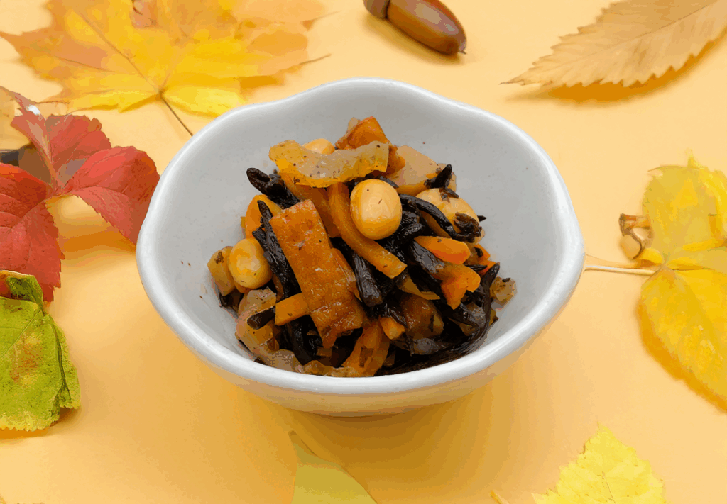 房州産の芽ひじきと人参・さつま揚げ・こんにゃく・大豆・蓮根を五目煮にしました。具沢山の煮物をお楽しみください。