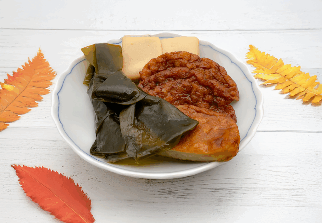 いわしで作った平天、根室産結び昆布、高野豆腐を、鰹節と昆布の出汁で煮ました。材料を別々に炊き上げているので、それぞれの良さもお楽しみいただける一品です。