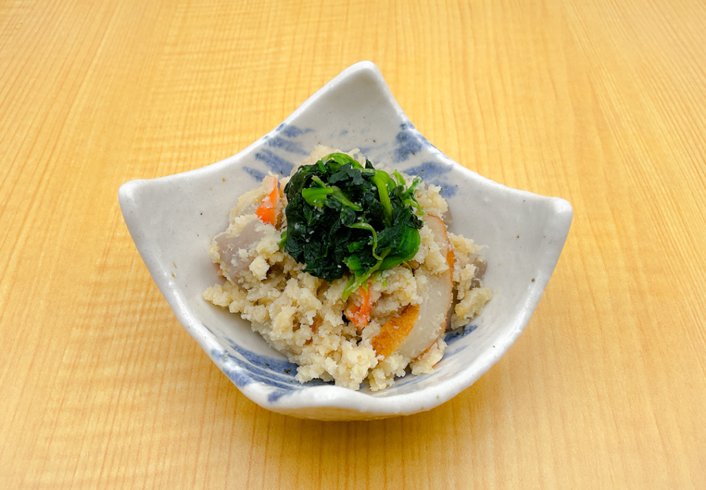 国産大豆のおからに、人参・牛蒡・さつま揚げ・油揚げ・れんこん・長葱と生姜を入れて、うの花にしました。寒い季節に合わせた味付けになっています。