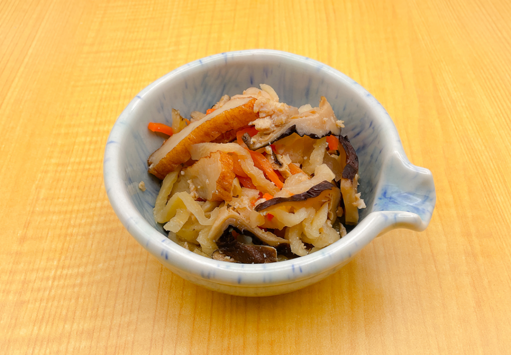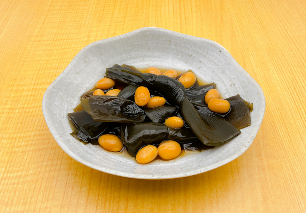 北海道根室産の昆布と岩手県産の大豆を浅炊き風の煮物にしました。素材が活きている出汁を含んだ、風味豊かな昆布と大豆をお召し上がりください。