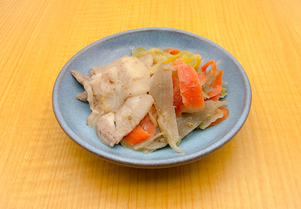 白金豚の豚バラとキャベツ・人参・牛蒡をゴマダレで煮物にしました。しゃぶしゃぶ風の味付けがさっぱりしています。