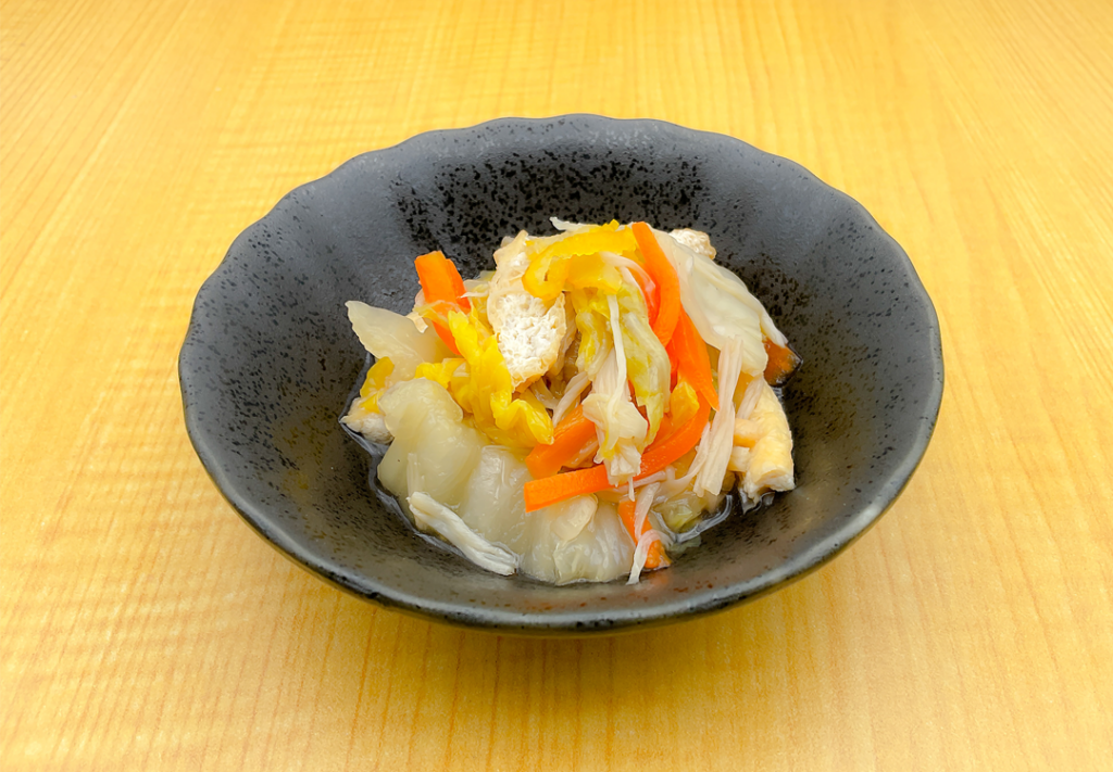 国産の白菜に、えのき・人参・油揚げとゆずの皮を入れ、さっぱりと香りのよいおひたしにしました。だしと素材の風味を活かした味付けにしておりますので、素材の味がより味わえます。