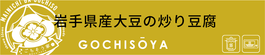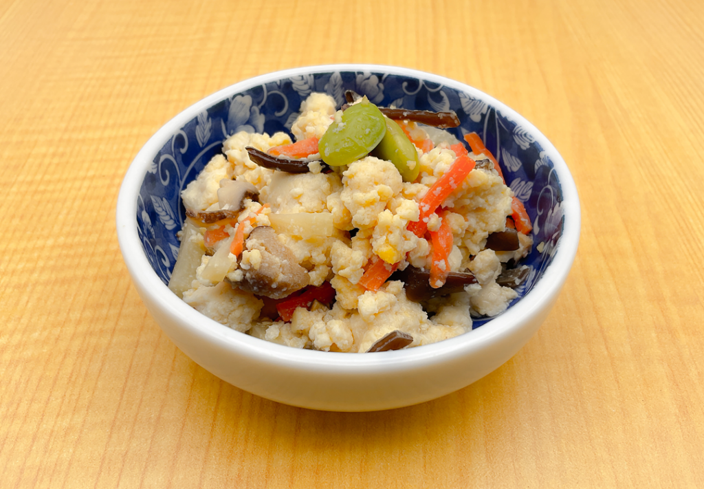 岩手県産大豆のお豆腐に、食感の良いキクラゲと香り豊かなむき枝豆を入れた、ヘルシーなお惣菜の定番料理、「炒り豆腐」です。優しい味わいが好評のメニューです。
